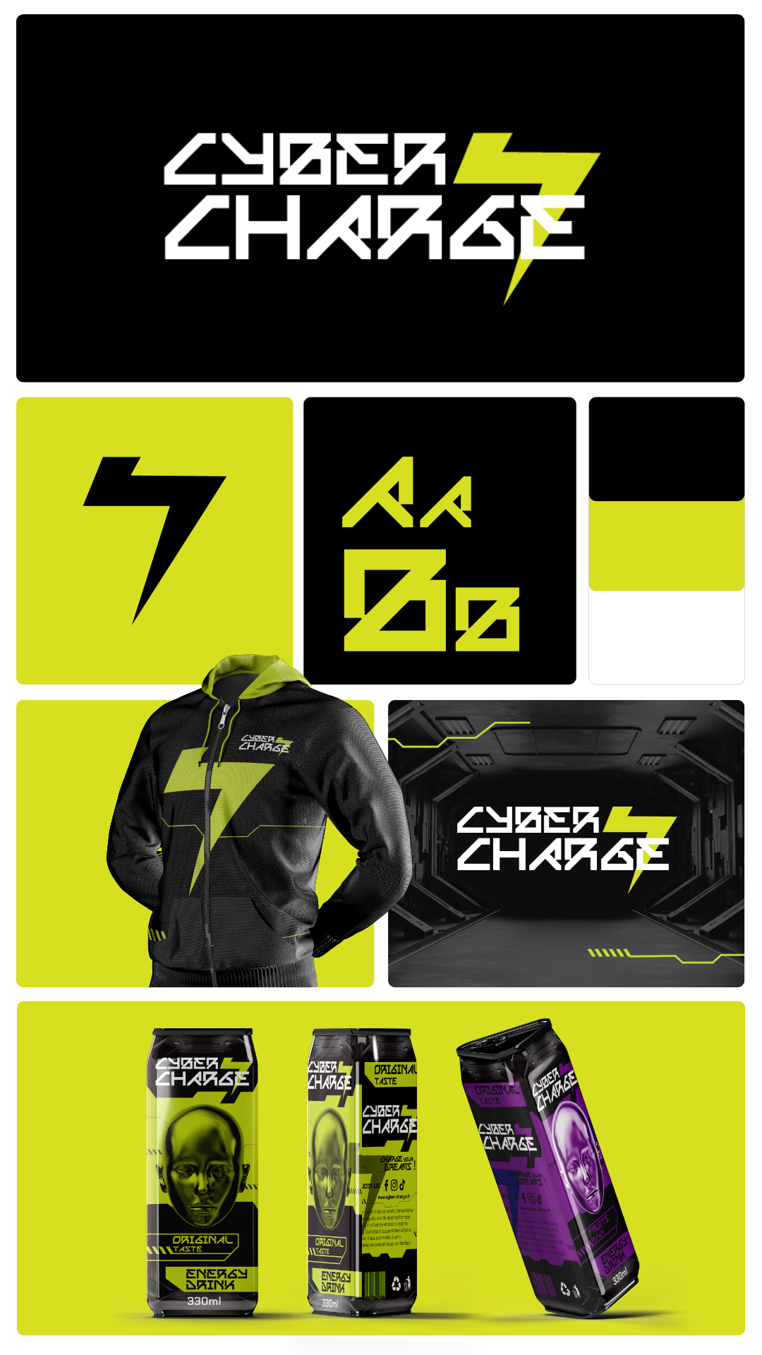 Cyber Charge est une marque fictive de boisson énergisante créée pour répondre aux besoins des gamers et des pratiquants de e-sport. Son identité visuelle s’appuie sur un style futuriste et sci-fi, intégrant une typographie moderne et des couleurs très vives voir acides qui expriment l’intensité de l’énergie apportée. Un élément fort de l’identité est la forme d’éclair, qui vient renforcer l’idée de puissance et de dynamisme, tout en symbolisant l’impact énergisant de la boisson. L’ensemble se veut immersif, en phase avec l’univers visuel des jeux vidéo et la culture gaming.